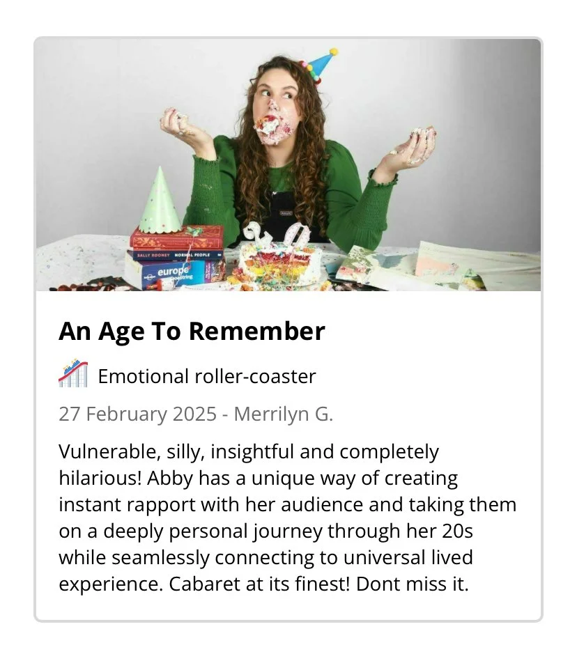 With a new decade unravelling before her, Abby is again seeking guidance - off the internet. So come in person to dish life advice to the best friend you never knew you didn't want. Bring your hopes and dreams for the 30s. Whether they’re behind you, in front of you, or you’re smack bang in the middle… let’s reminisce, plan and discuss the decades behind and before us.