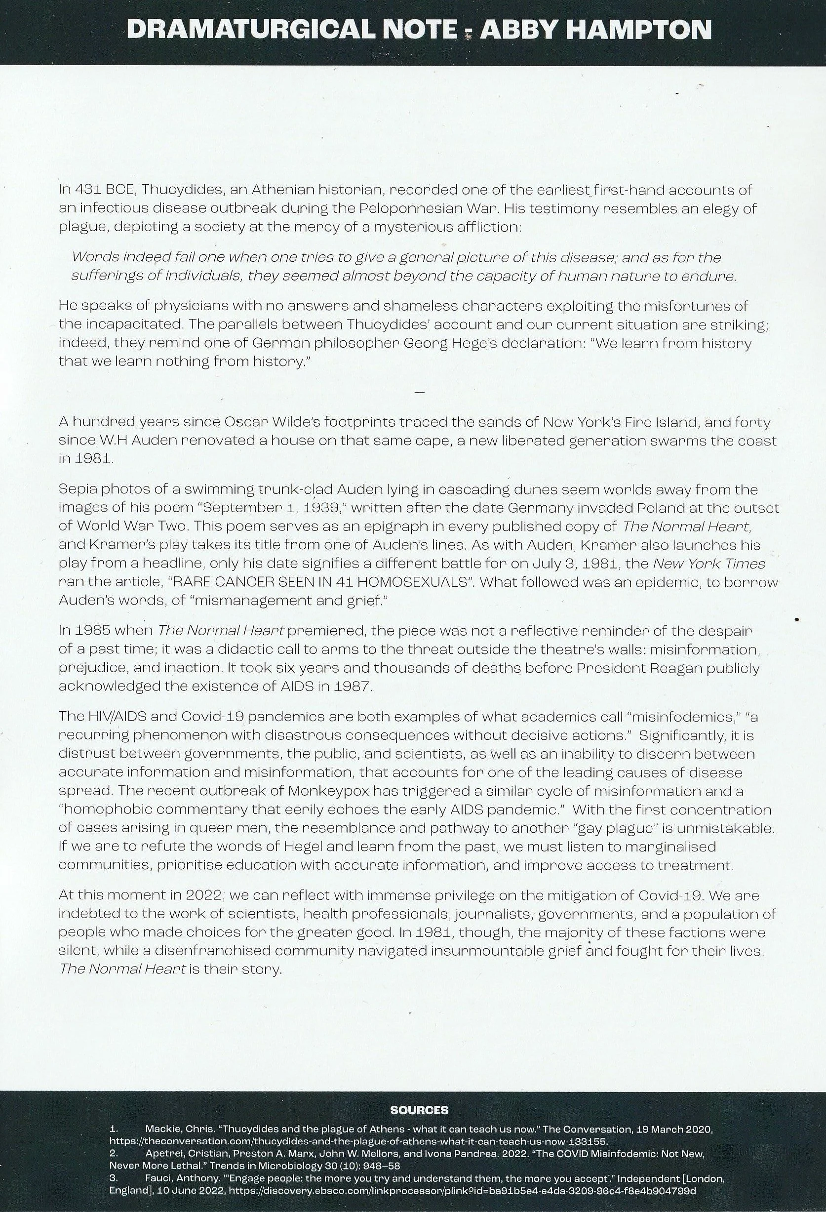 The Normal Heart Dramaturgical Secondment DirectorDean BryantClientState Theatre Company of South AustraliaYear2022 Program Contributions